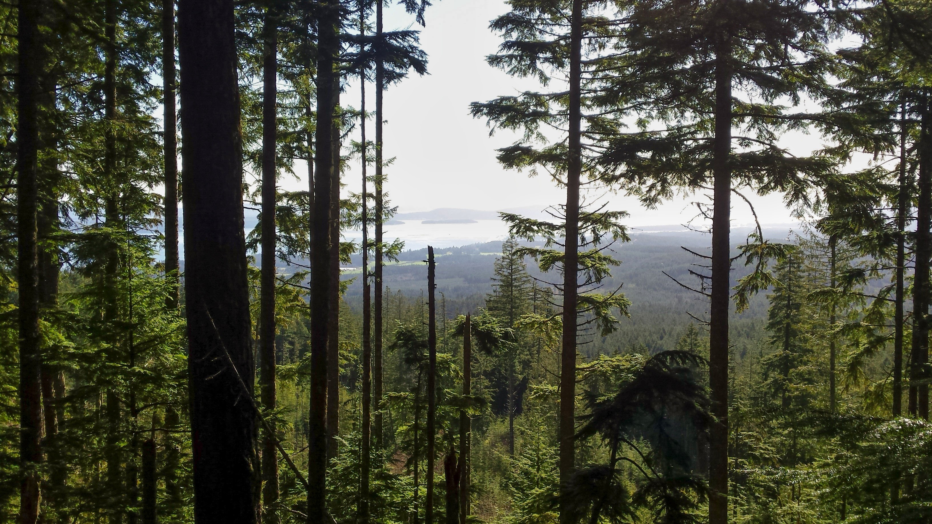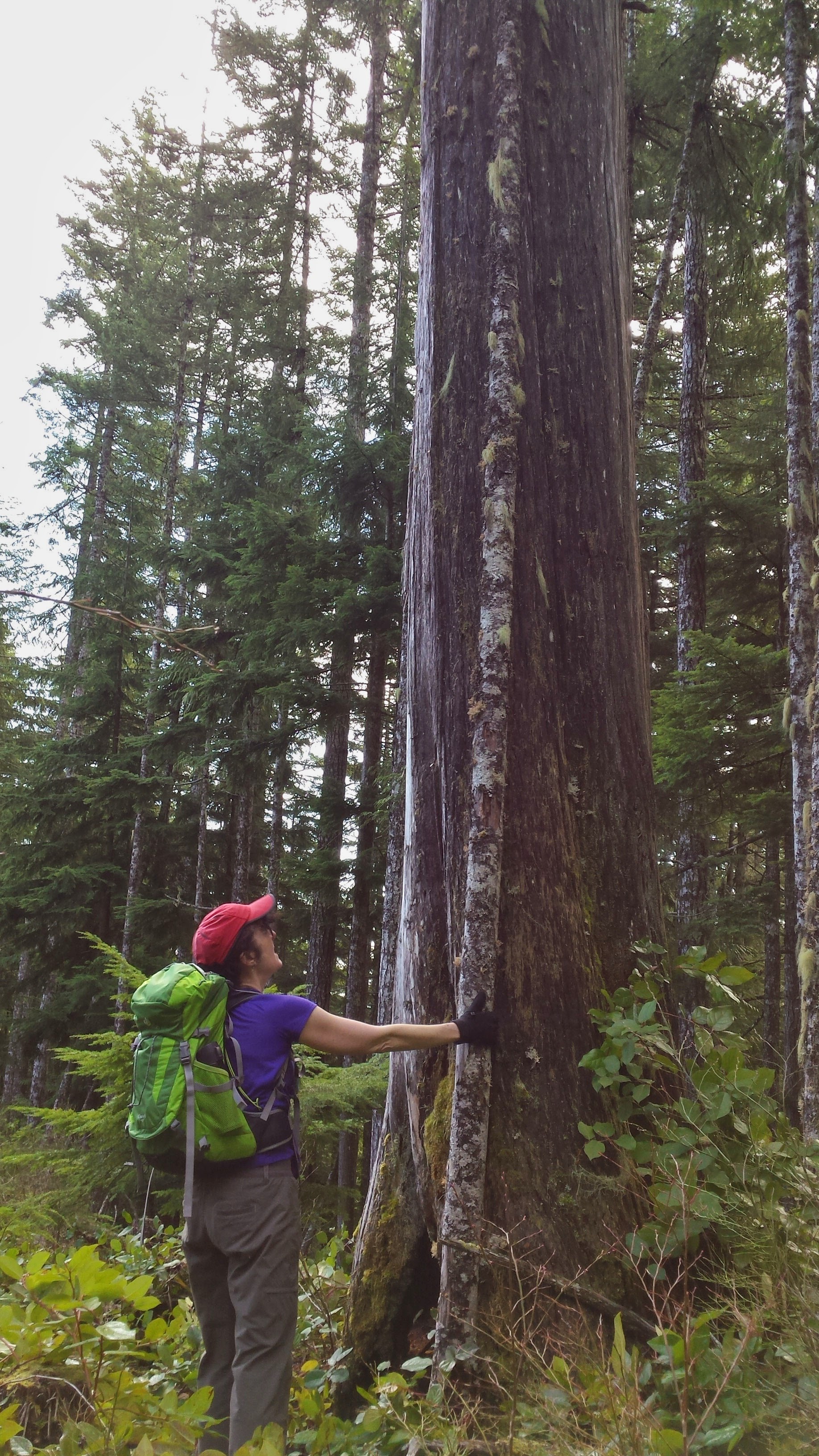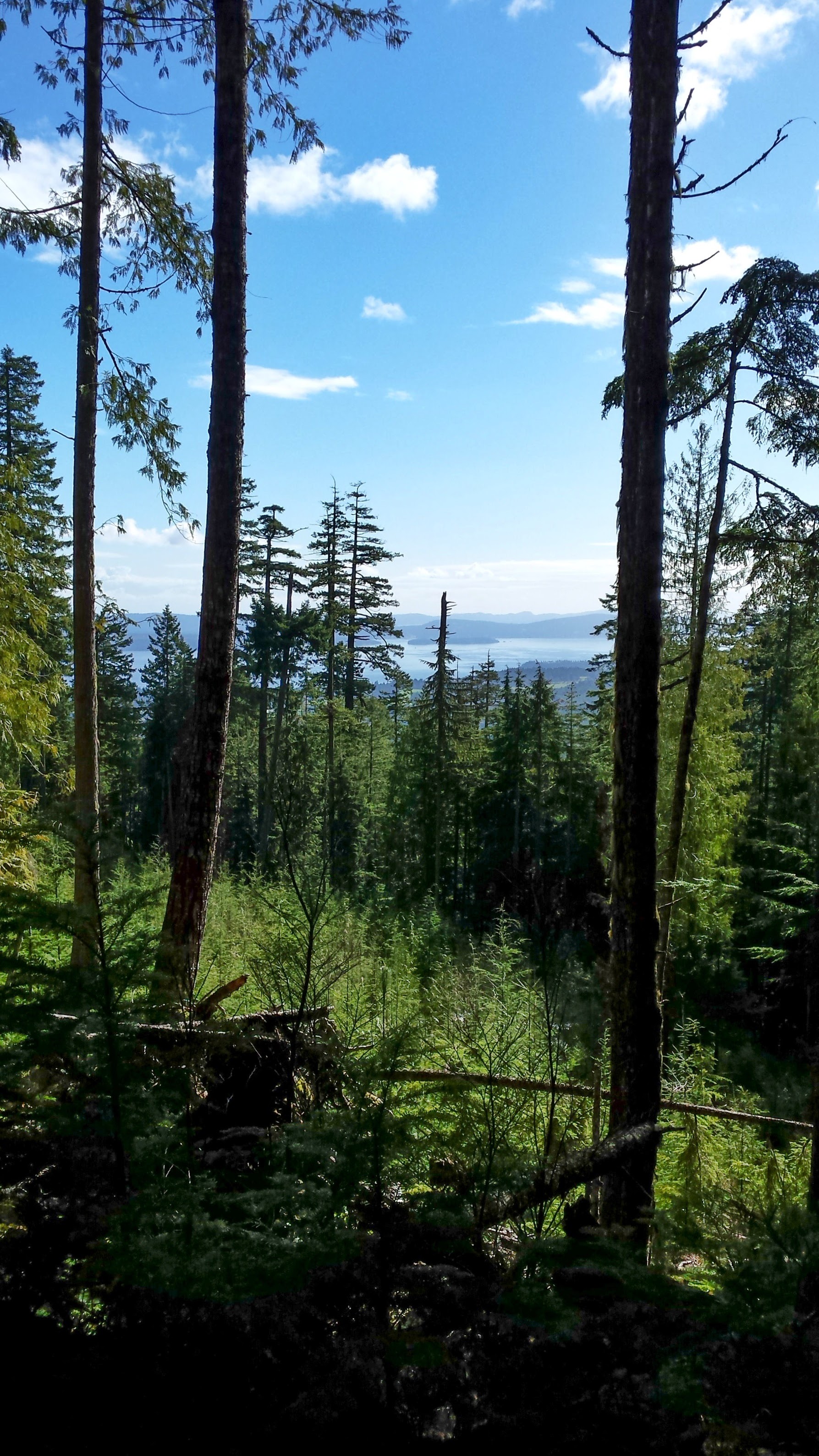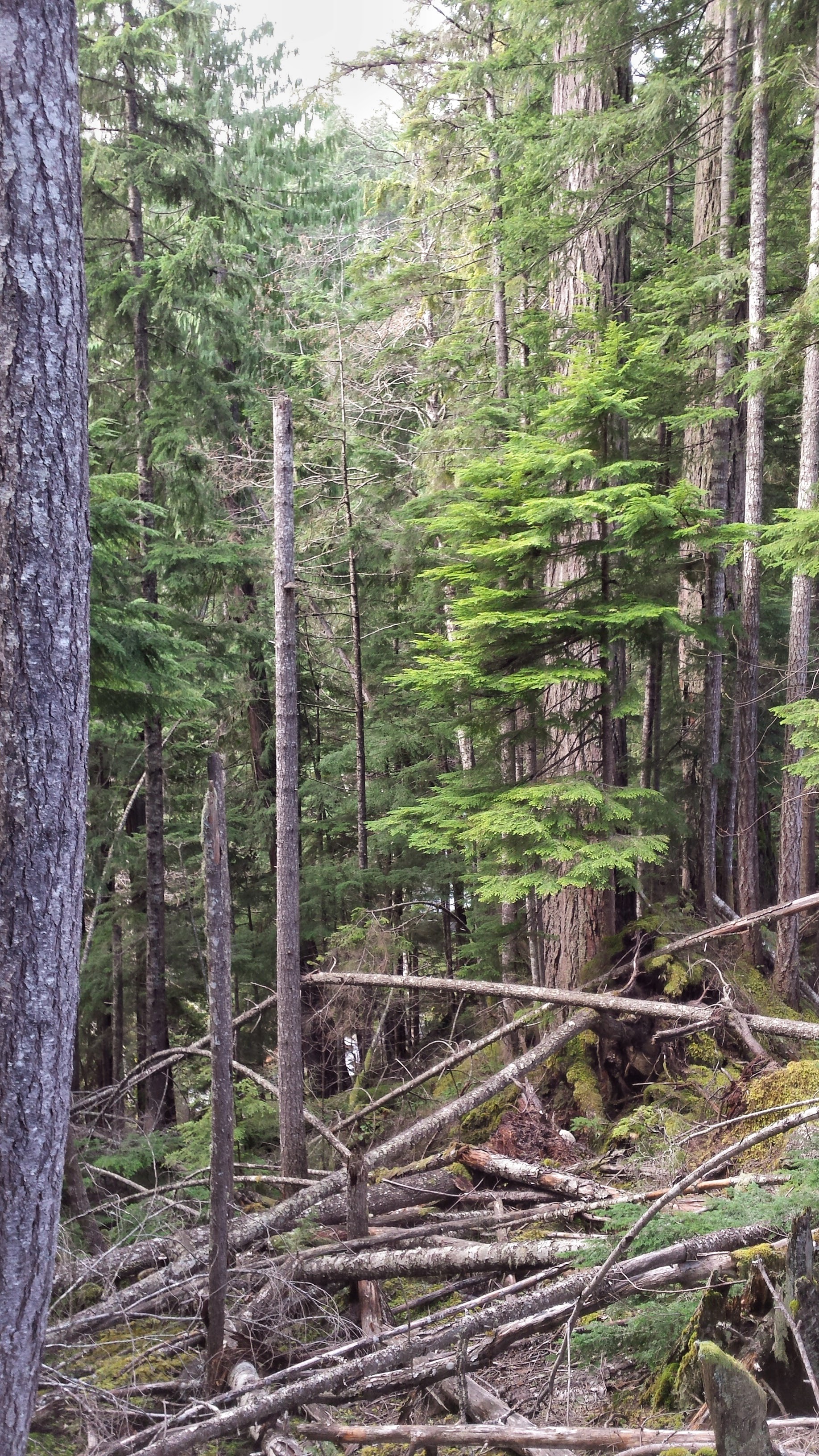 We chose what seemed to be the easier path, downstream, and found ourselves in a very pretty patch of forest, with 30-ish year-old growth, with scattered patches of much much older cedar and fir. Game trails and a series of rock outcrops gave us a natural path downstream. We left the creek, as it curved southeast, and veered north, on an easy course back down to the road.