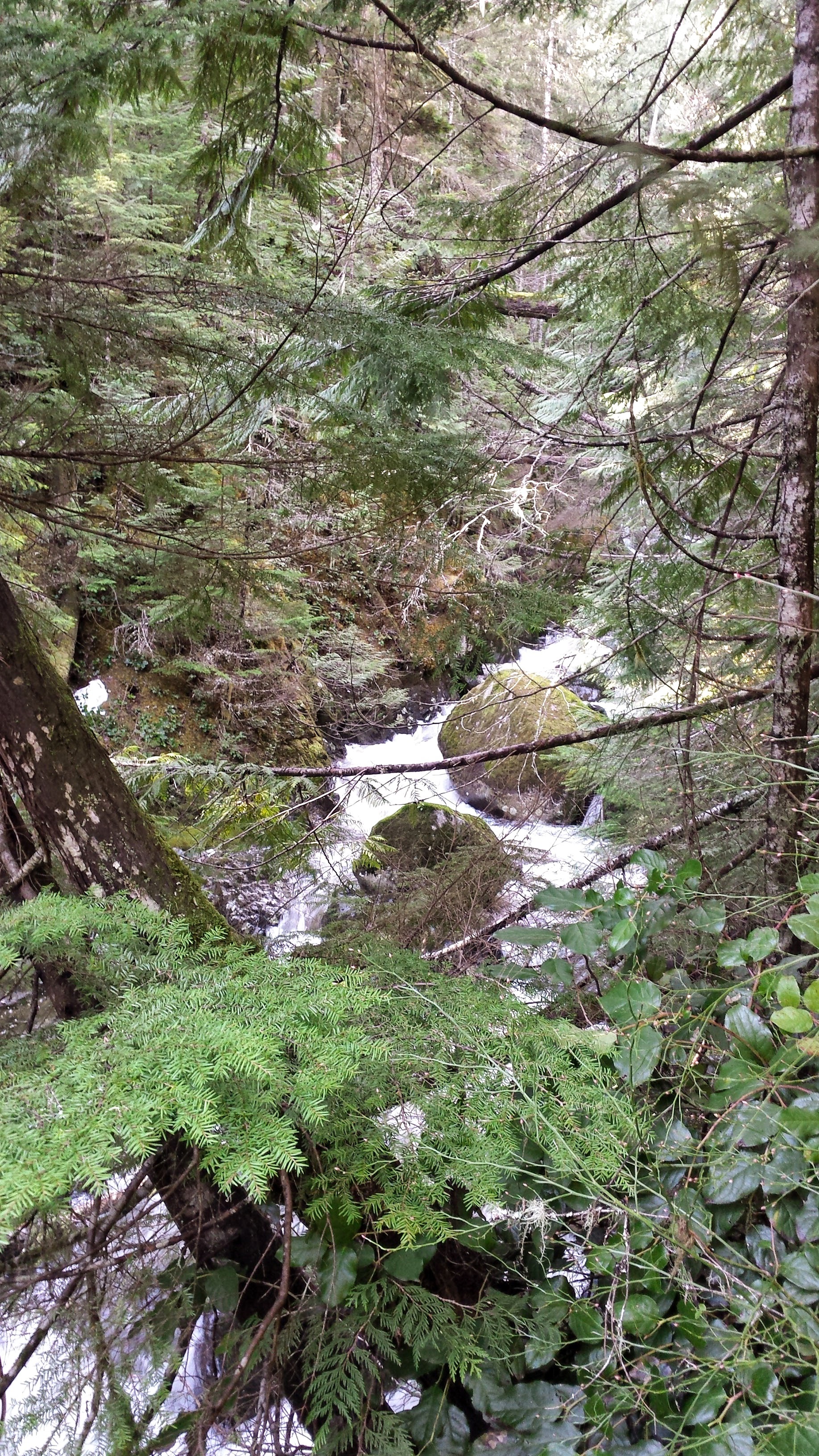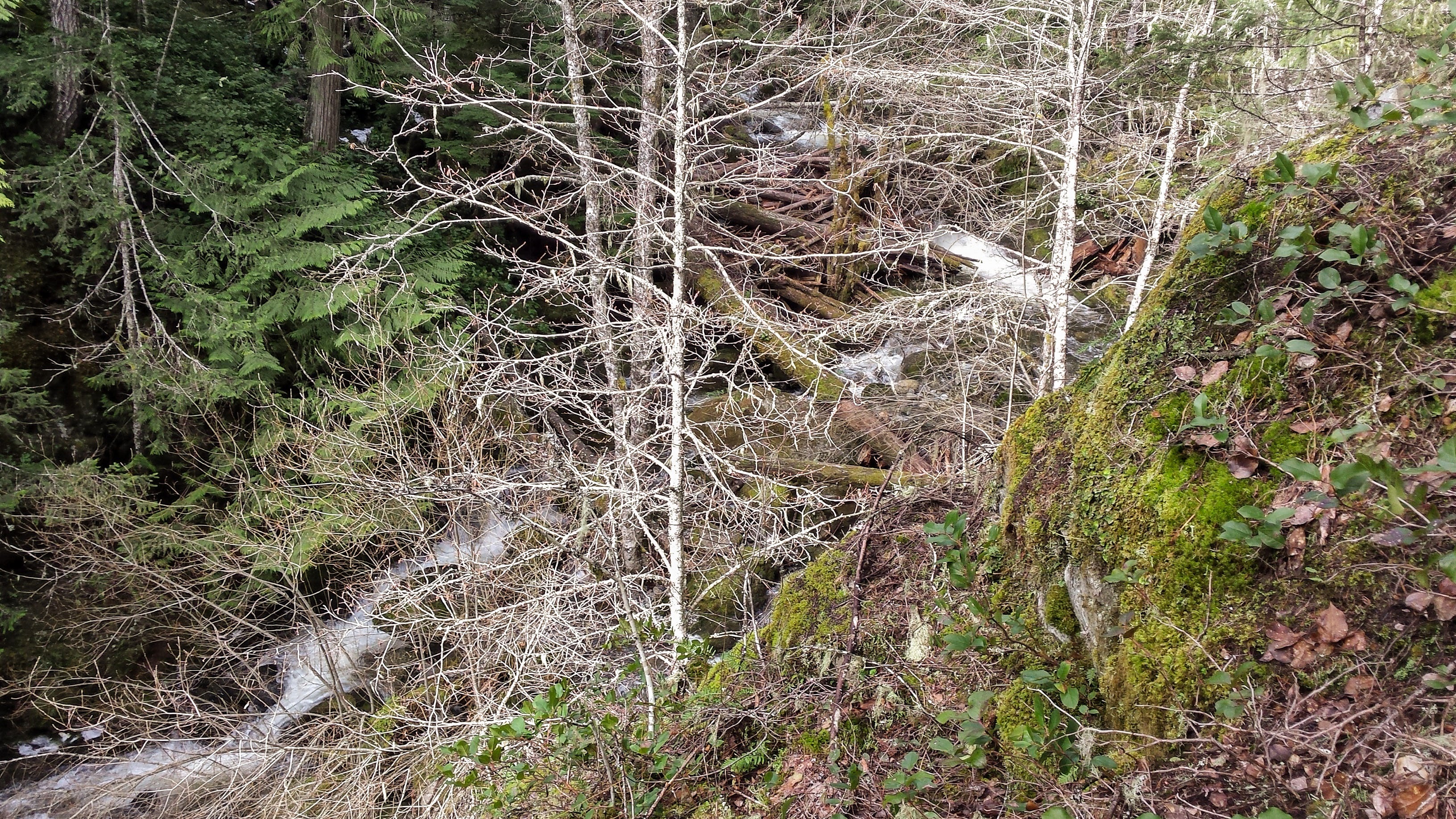 From Stocking Lake, we cut through the bush to the Banon logging road, then up a side road. From there, we were into heavy bush and steep terrain. We let our ears guide us to the roar of the creek. We found that it was cascading down a steep canyon, visible, but not approachable.