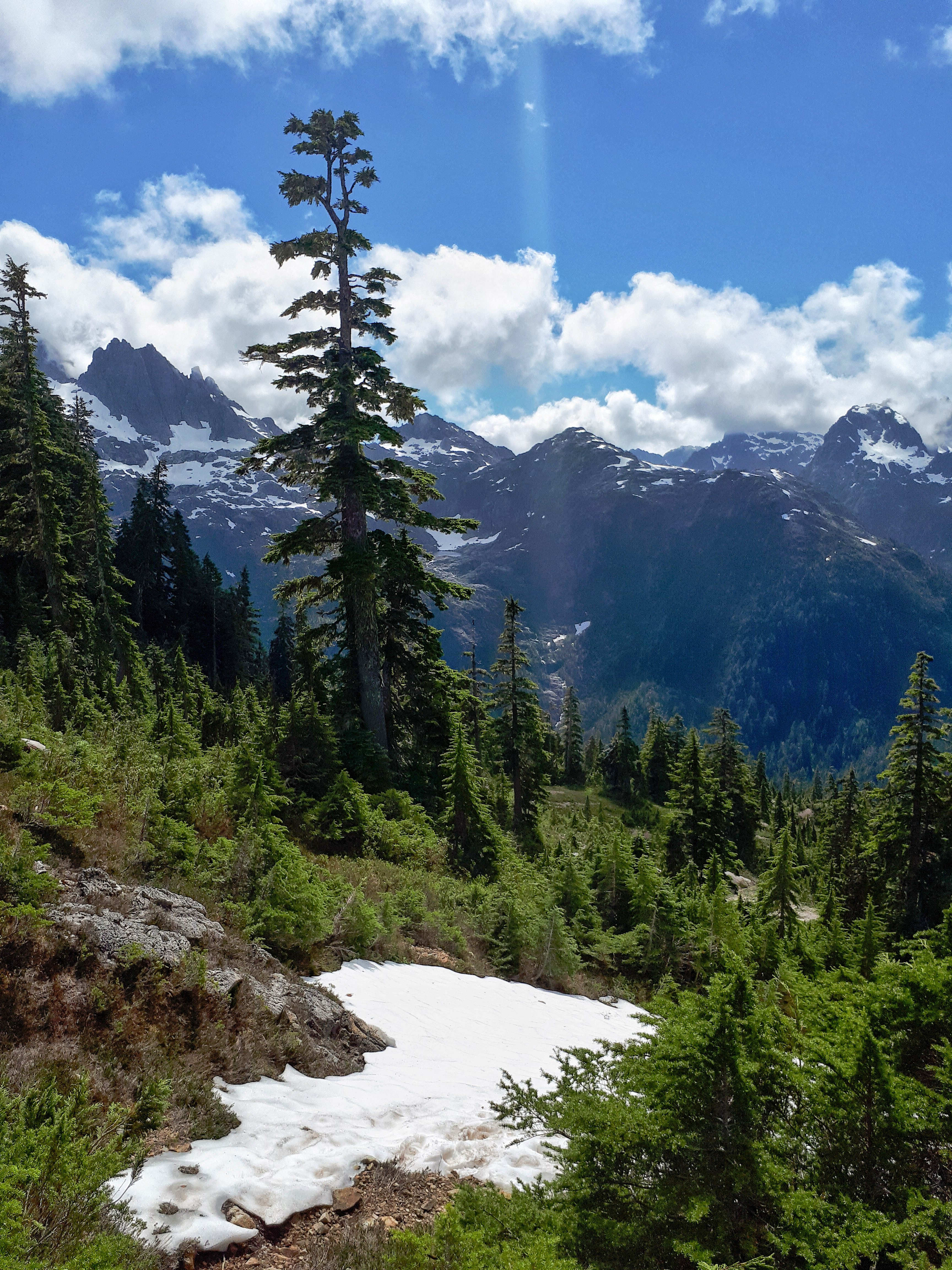 From the trail head, we headed up through on old clear-cut that is growing back nicely. A steep ascent to Cobalt Lake was rewarded with views of 5040 and her subordinate bumps along with Triple Peak and Cat Ears. After a quick bite, we were off for the summit along a trail that ascended through the forest, crossed heather slopes and a couple of steep snow slopes before turning the shoulder to give us our first views of Nahmint in the distance. A quick ridge walk and we were at the summit for a snack, photos, soaking up the views and adding a new summit register book to the container. Down was…well, down. Back at the lake in less than an hour and back at the vehicle an hour after that. All in all a great day with great people.