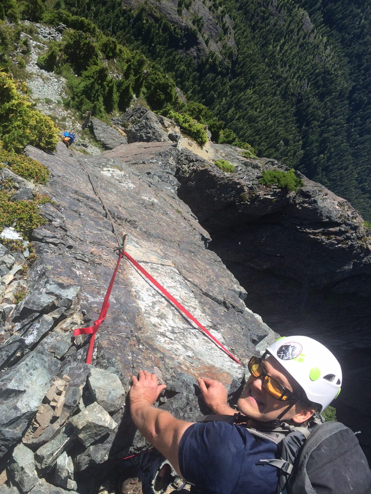 It’s this section we gave the most consideration to in our planning. We knew that it was going to be a scramble, and it didn’t disappoint. We ascended one at a time, and each of us sent more than one rock down the chute. The route is obvious, but eventually, I was faced with an option of going to the right into the bush, or to the left along a smooth rock shelf with extreme exposure. I took the left. Once we were past the scramble, we clamoured over the choss pile that makes up the summit (1481m) to reach the cairn. Or at least, that was the plan– I was damn near carried off by a hundred thousand flying ants. They were all determined to stand on top of my helmet, the new highest point on the mountain.