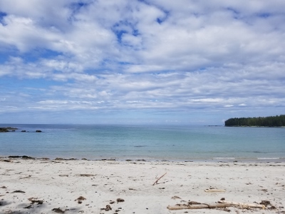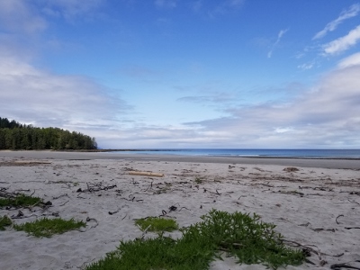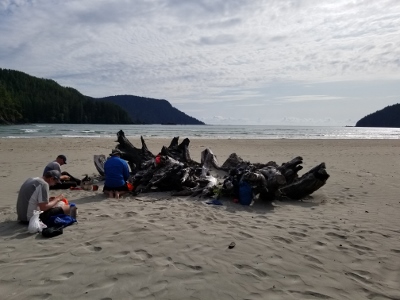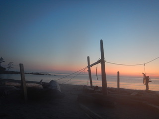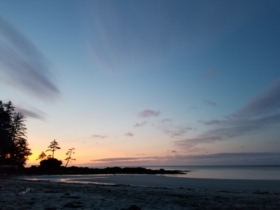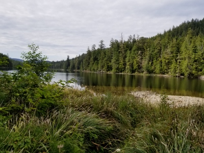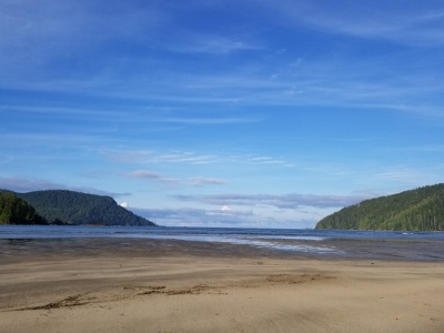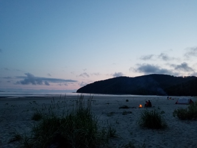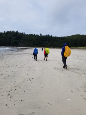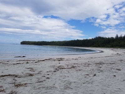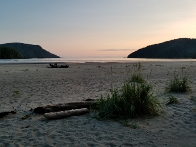Sunday morning, we arrived at the trailhead, eager to get started after 1 hr 45 min on the logging road.  We followed the well used trail past the Eric Lake campsite, over the new bridge at Fisherman River, and past the junction to Nels Bight before arriving at Nissen Bight 5 hours later, our home for the next two nights.  After setting up camp, we headed to the water source at the opposite end of the beach.  No whales were spotted, but we did see a large black bear happily grazing on the grasses above the beach.  We arrived back at camp ready to relax and enjoy dinner, and were treated to a beautiful sunset that evening.