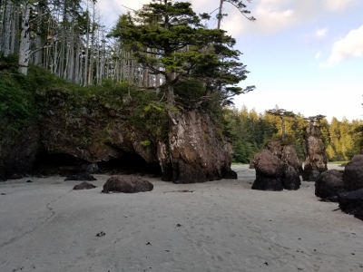 Tuesday morning, we packed up camp and headed back out to San Josef Bay for our last night. We stopped for lunch at Eric Lake, where we quickly ate and moved on to avoid the clouds of mosquitoes. After hearing that the water supply at 2nd beach was scarce, we decided to re-fill our water at the well-flowing creek just south of Eric Lake. We arrived at San Jo Bay with plenty of time to set up camp, relax, check out the sea stacks and a couple of sea caves, and enjoy our last night in this beautiful place.