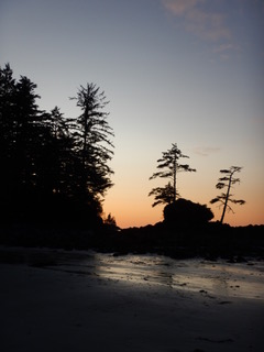 Sunday morning, we arrived at the trailhead, eager to get started after 1 hr 45 min on the logging road. We followed the well used trail past the Eric Lake campsite, over the new bridge at Fisherman River, and past the junction to Nels Bight before arriving at Nissen Bight 5 hours later, our home for the next two nights. After setting up camp, we headed to the water source at the opposite end of the beach. No whales were spotted, but we did see a large black bear happily grazing on the grasses above the beach. We arrived back at camp ready to relax and enjoy dinner, and were treated to a beautiful sunset that evening.