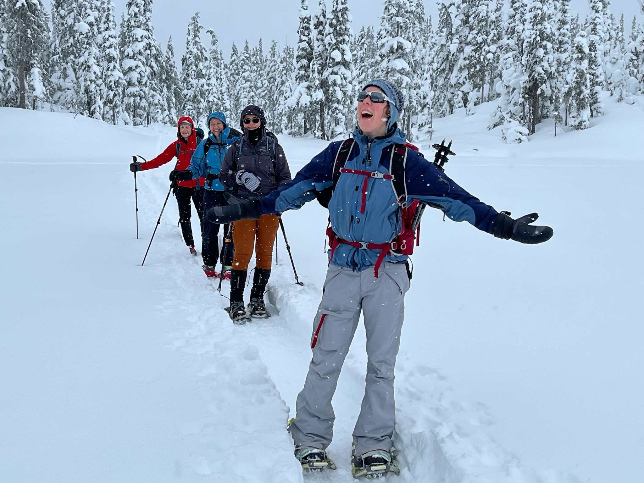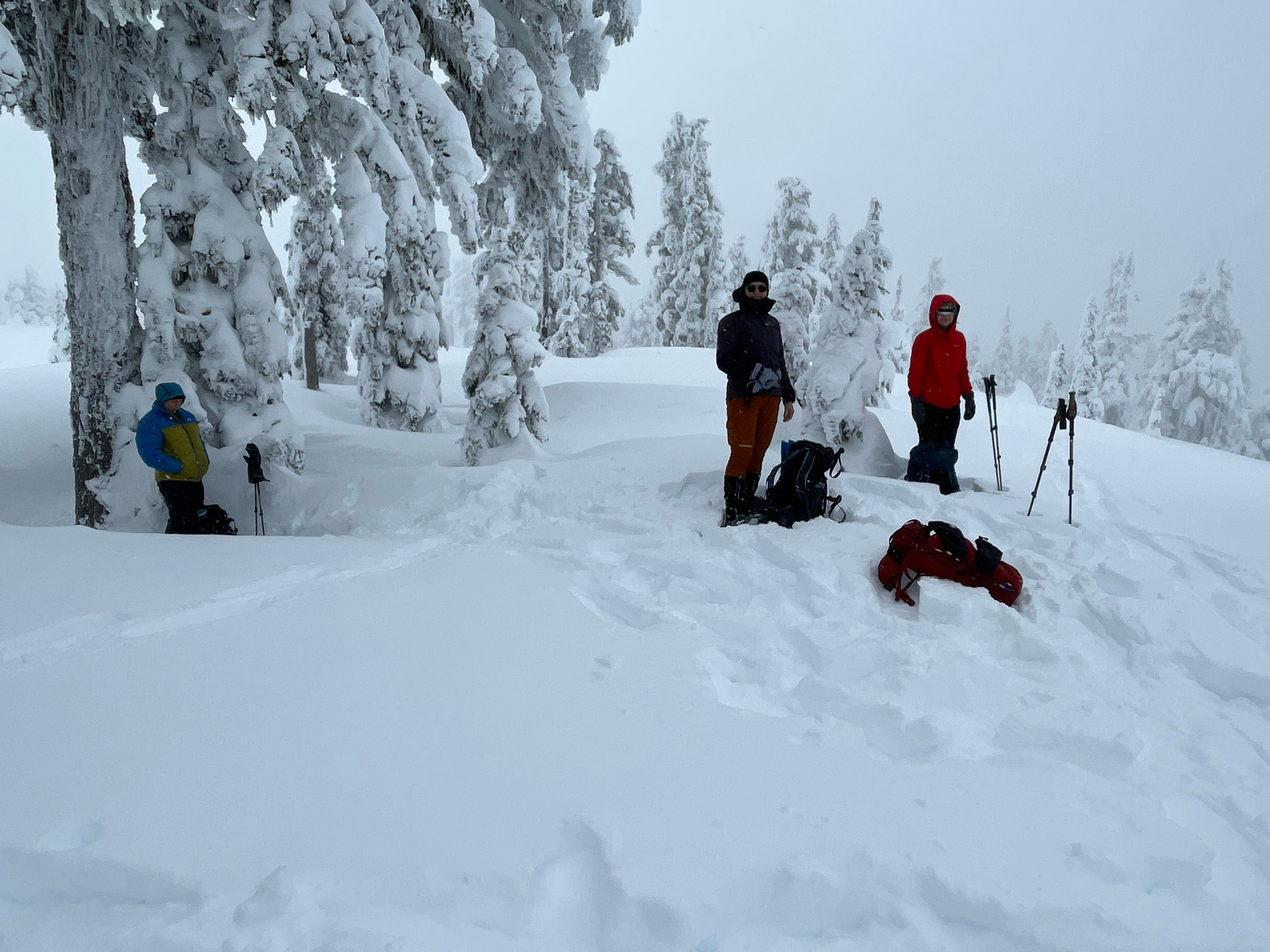 After a flurry of early morning communications and a change in leader, five of us headed for Mt Elma on snowshoes from Raven Lodge. Although the parking lot was full, the trails were quiet. Fortunately someone had the same destination in mind and kindly broke trail for us. Conditions were ok with the temperature around minus 4, light snow, and light wind. The snow is quite deep and loose so it took some effort to get up to the summit ridge. Visibility was almost nil, but the windrifted snow and the mantled trees made the trip worthwhile.