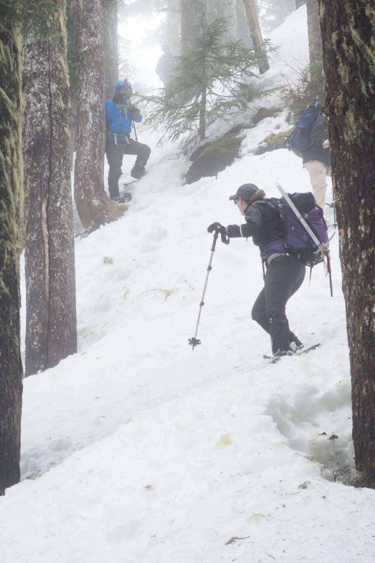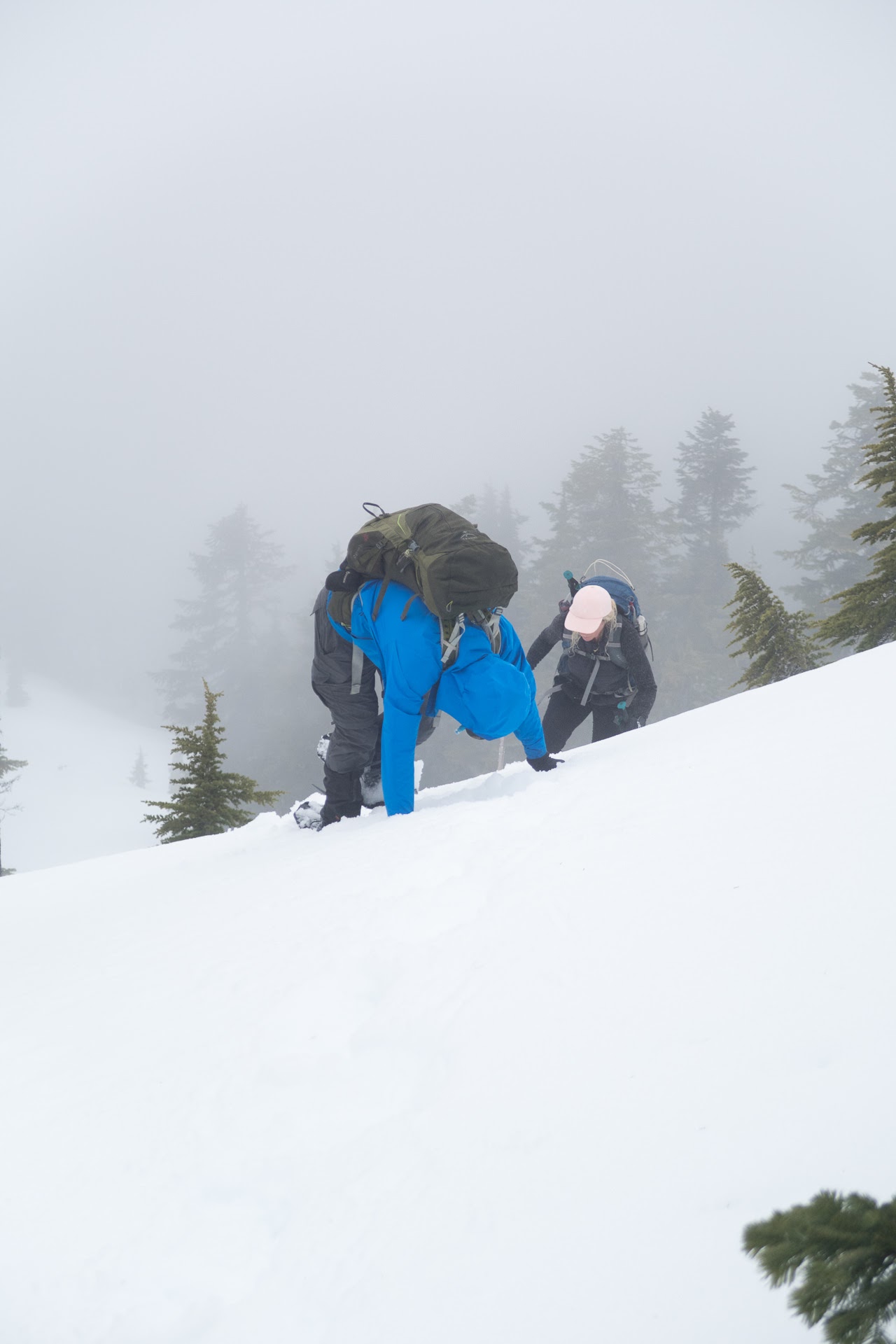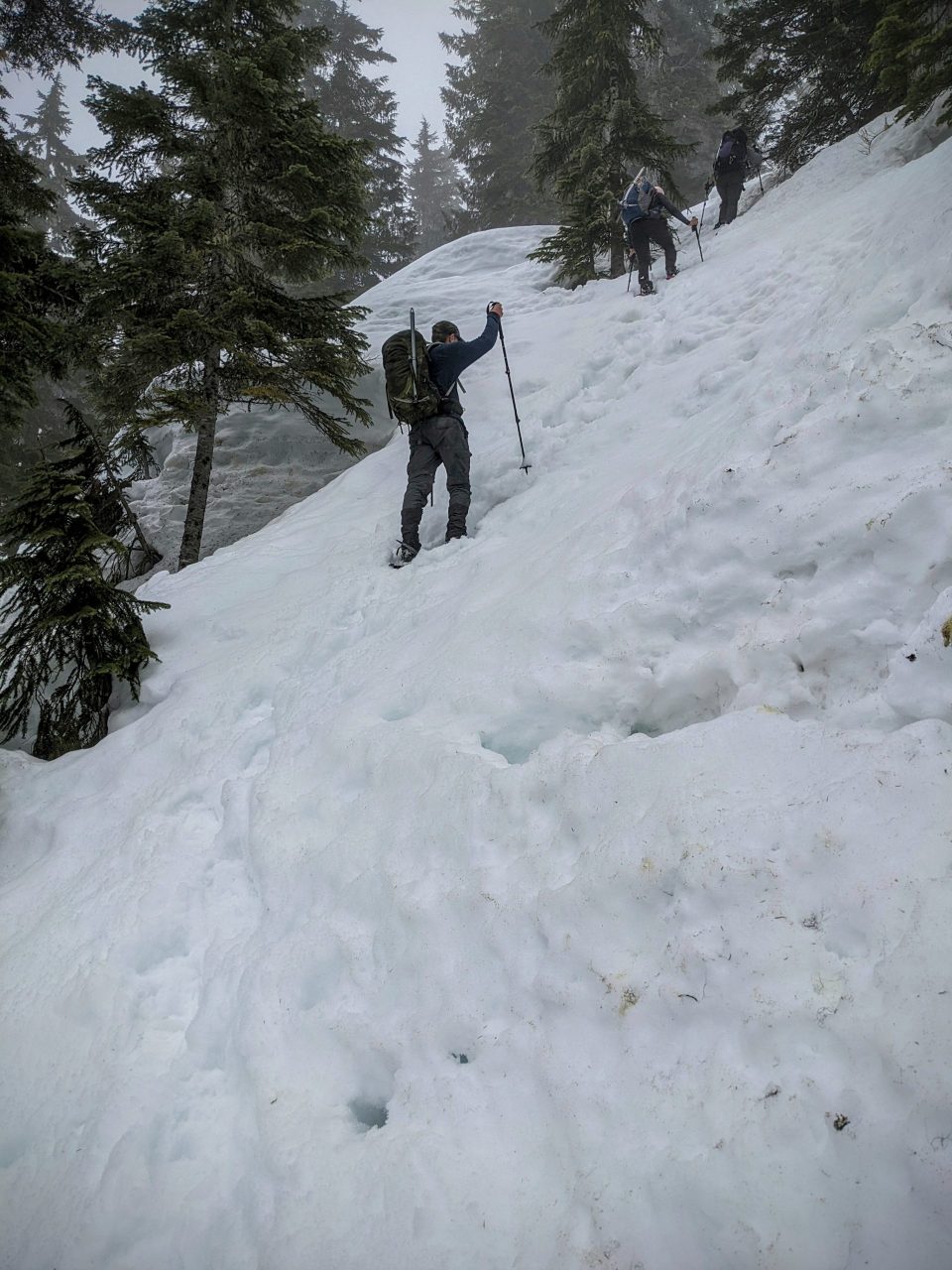 The weather sucked… clouded in and no blue sky; until we were back at the vehicles. It rained lightly which wasn’t too bad except it made the snow conditions a lot worse, heavy and wet.