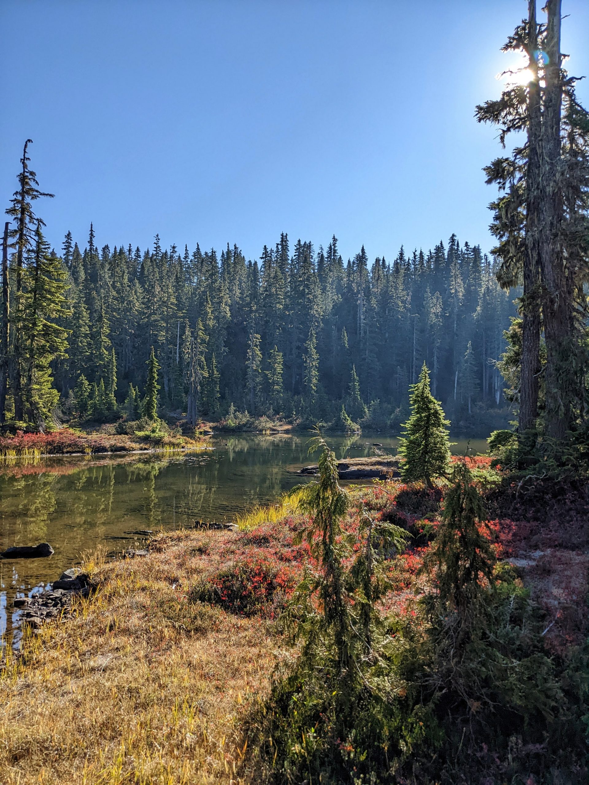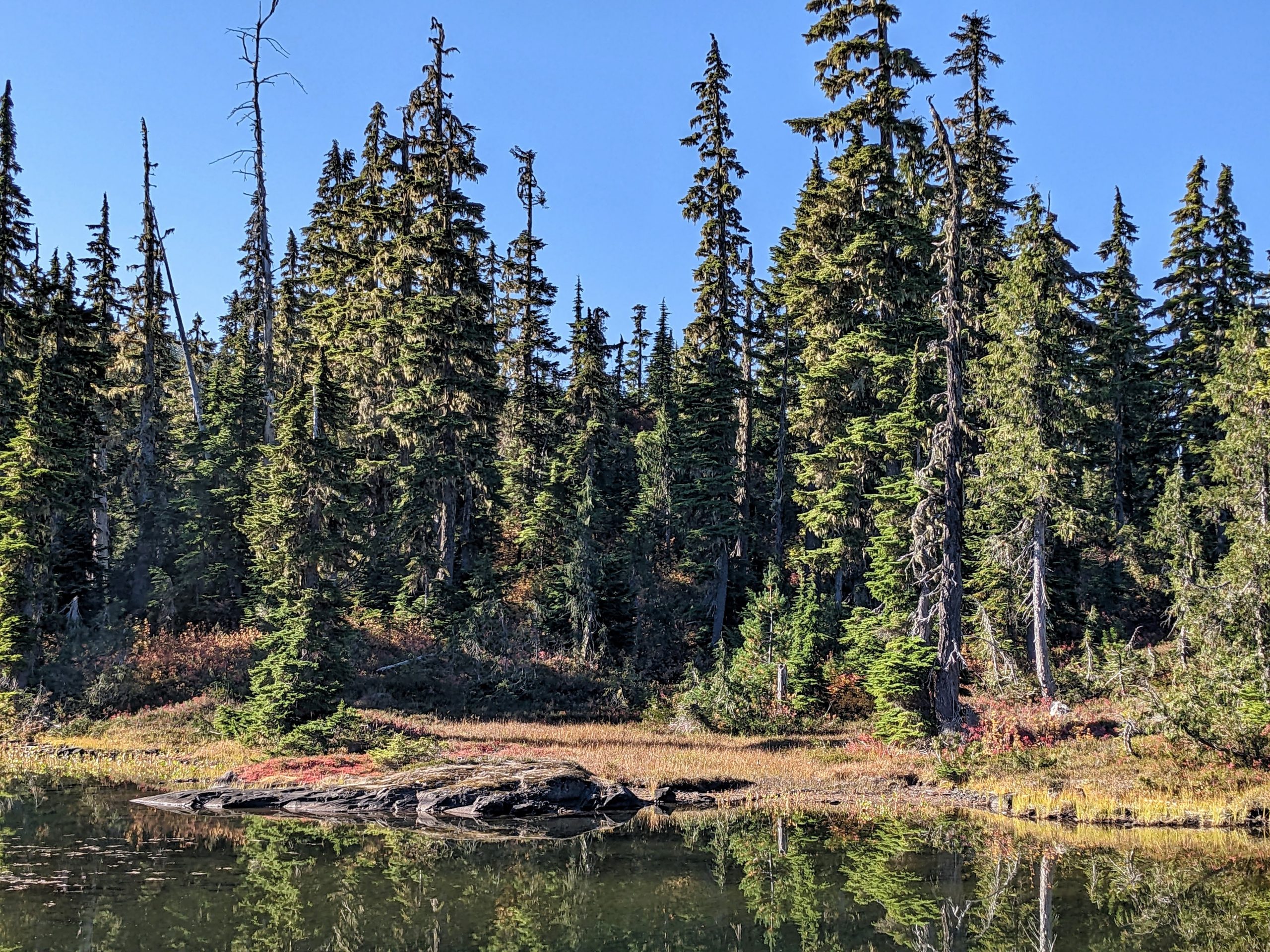 A group of 5 people gathered at the Paradise Meadows trailhead. Paper maps were pulled out (guess our median age!) and possible routes were discussed. We sketched out a plan, and headed up past Battleship Lake. The air was cool, but we shed layers of clothing fairly soon, as the hike warmed us. The fall colours glowed in the sun.