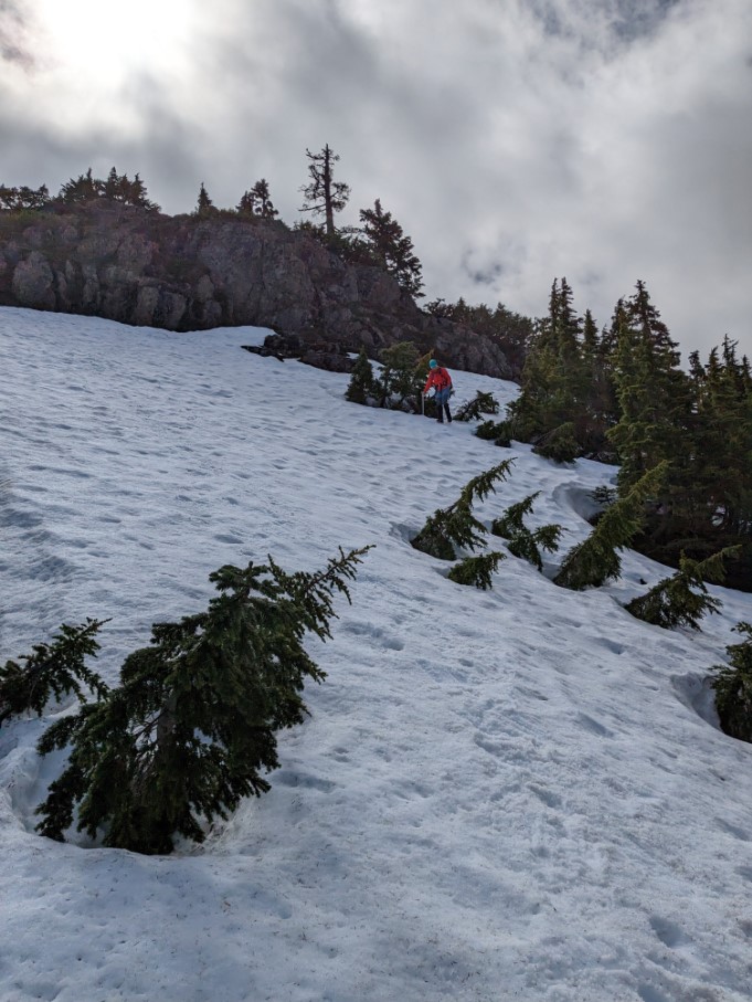 We parked at 1040m and made our way up the recent slash to the tree line where travel got a bit easier. We wound our way up and across the ridge to the first high point and began to get confused.