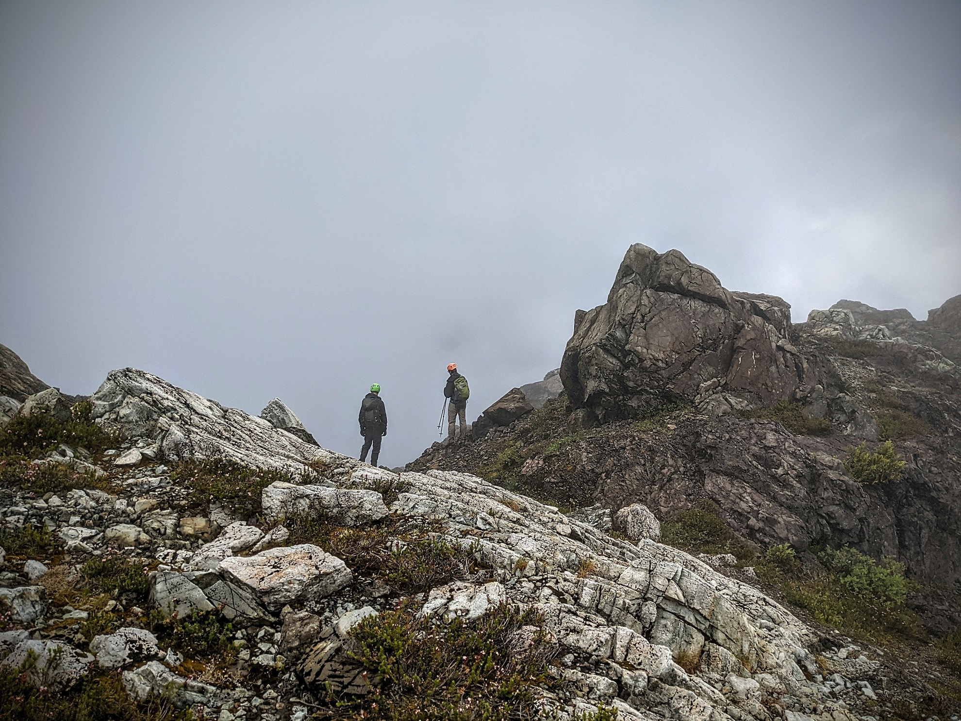 We were a group of four, including Hemingway (now 8 years old), who braved the misty forest and cloud-drenched slopes of Mount Moriarty on September 18th. It’s been seven years since my last trip up these familiar slopes and along the rolling ridge. In that time, the route has become more defined, easier to follow.